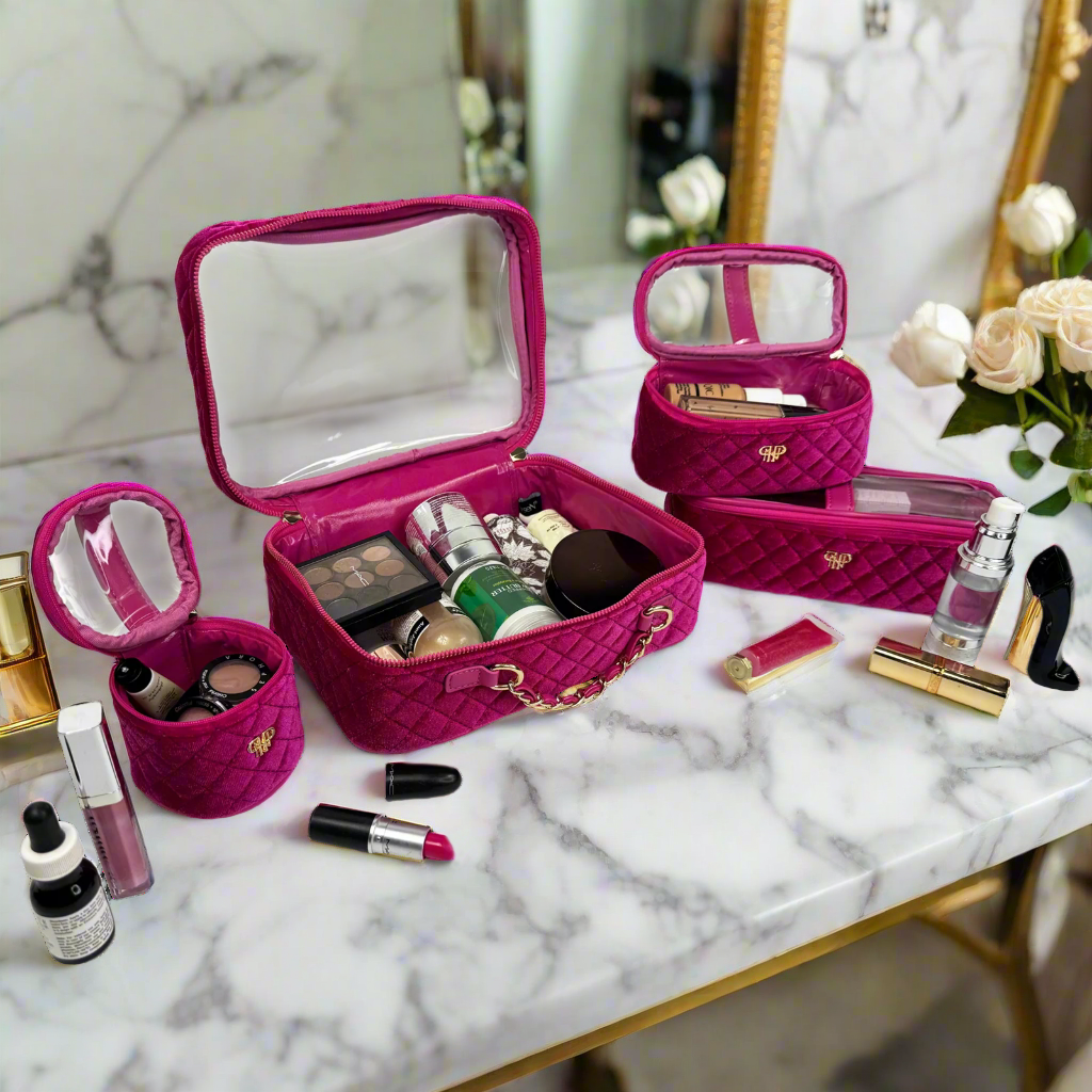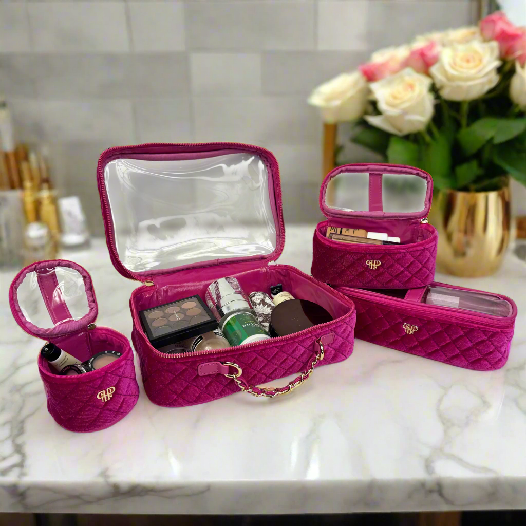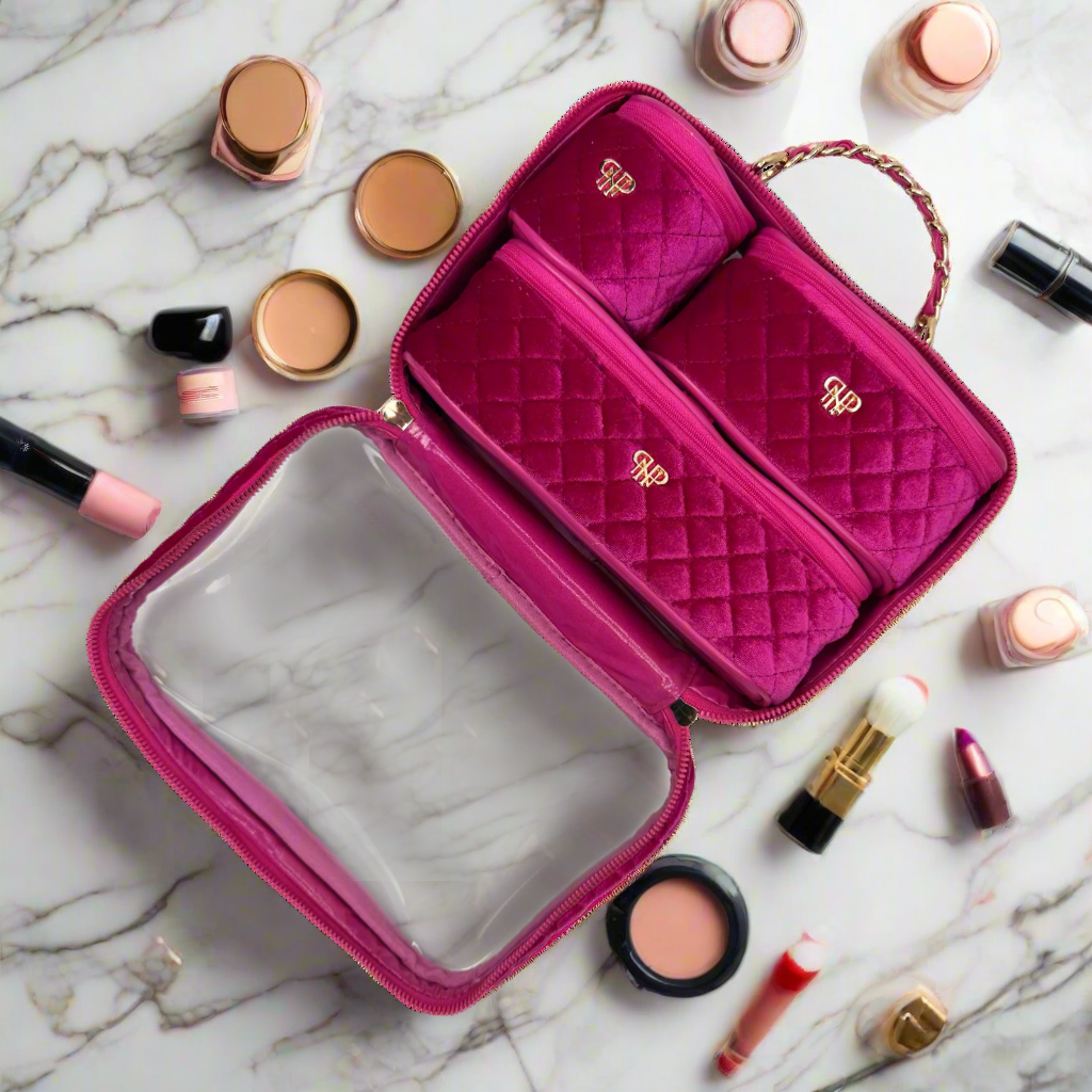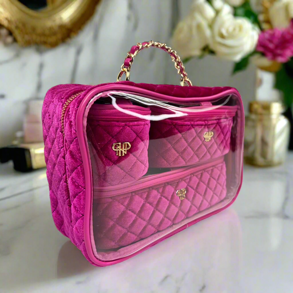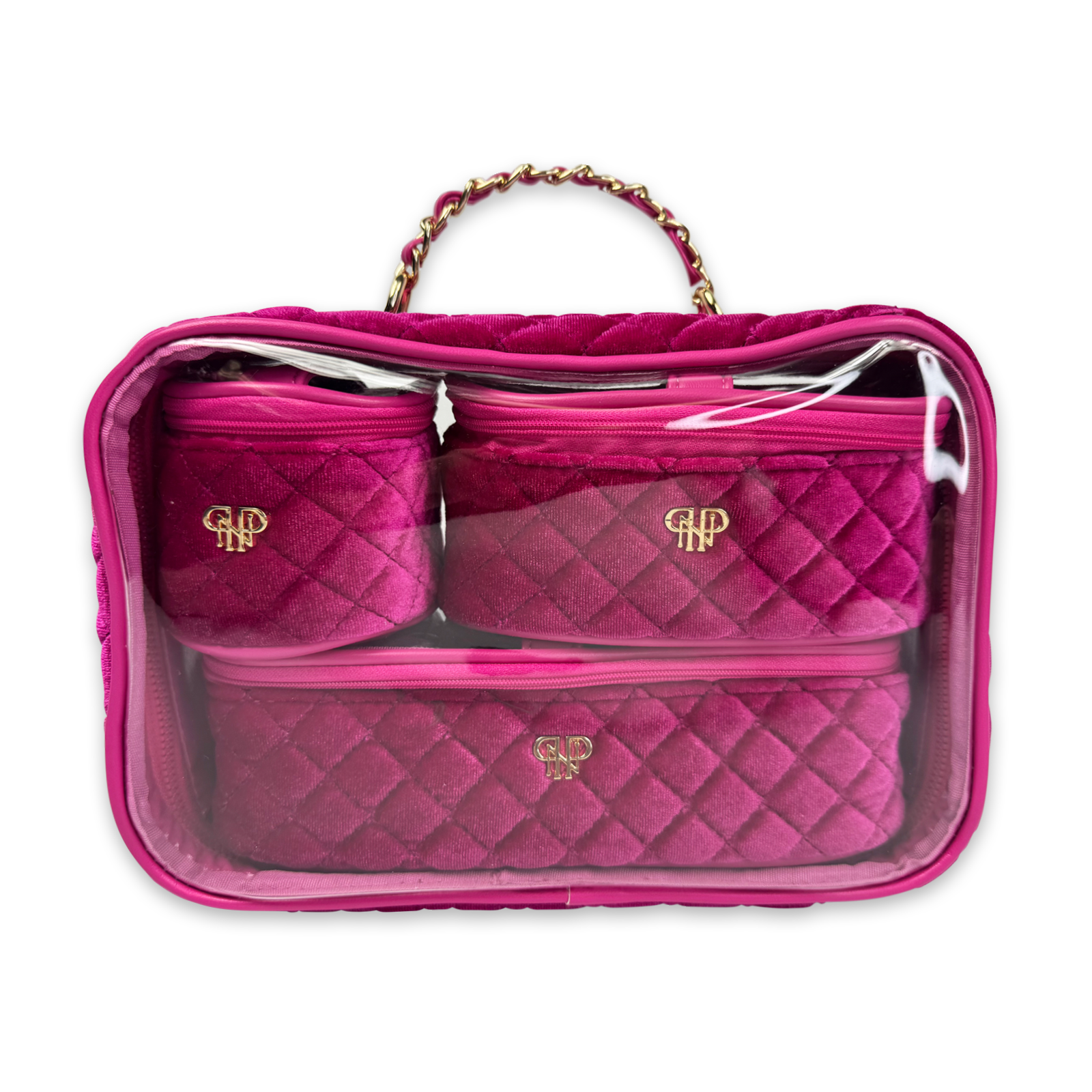 The Trio Jet Setter is your four-in-one answer to beauty on the go - elegant, organized, and effortlessly chic. The quilted Fuchsia Velvet takes sophisticated to a whole new level. Inside the clear, structured case with designer inspired chain handle are three removable companion cases (extra small, small, and medium), perfectly sized to keep your makeup, skincare, and everyday essentials in flawless order. Whether you're heading to the office, the gym, or a weekend escape, the Trio Jet Setter keeps everything in place - and your routine looking fabulous every step of the way.