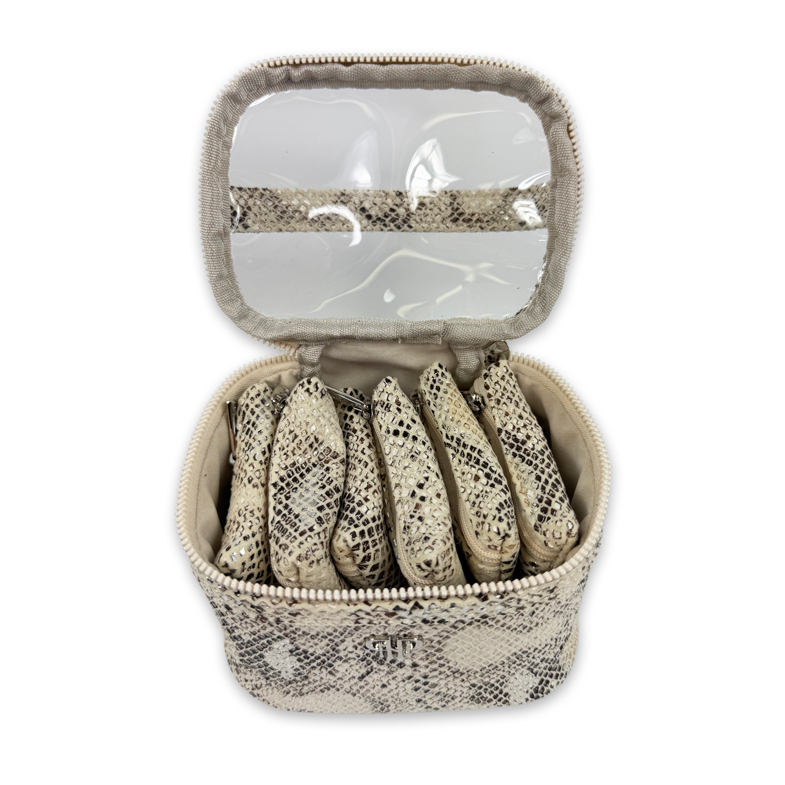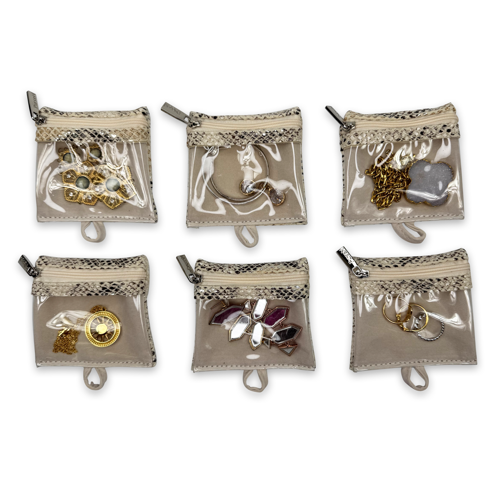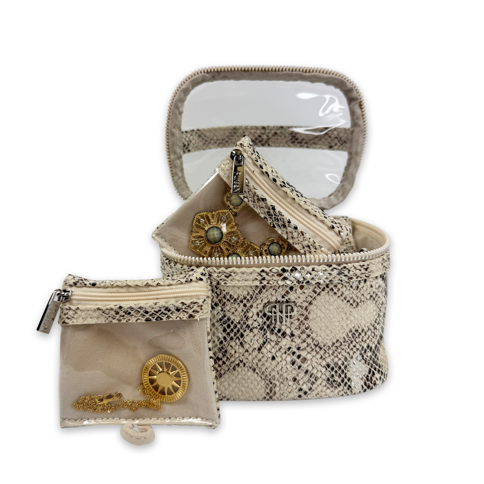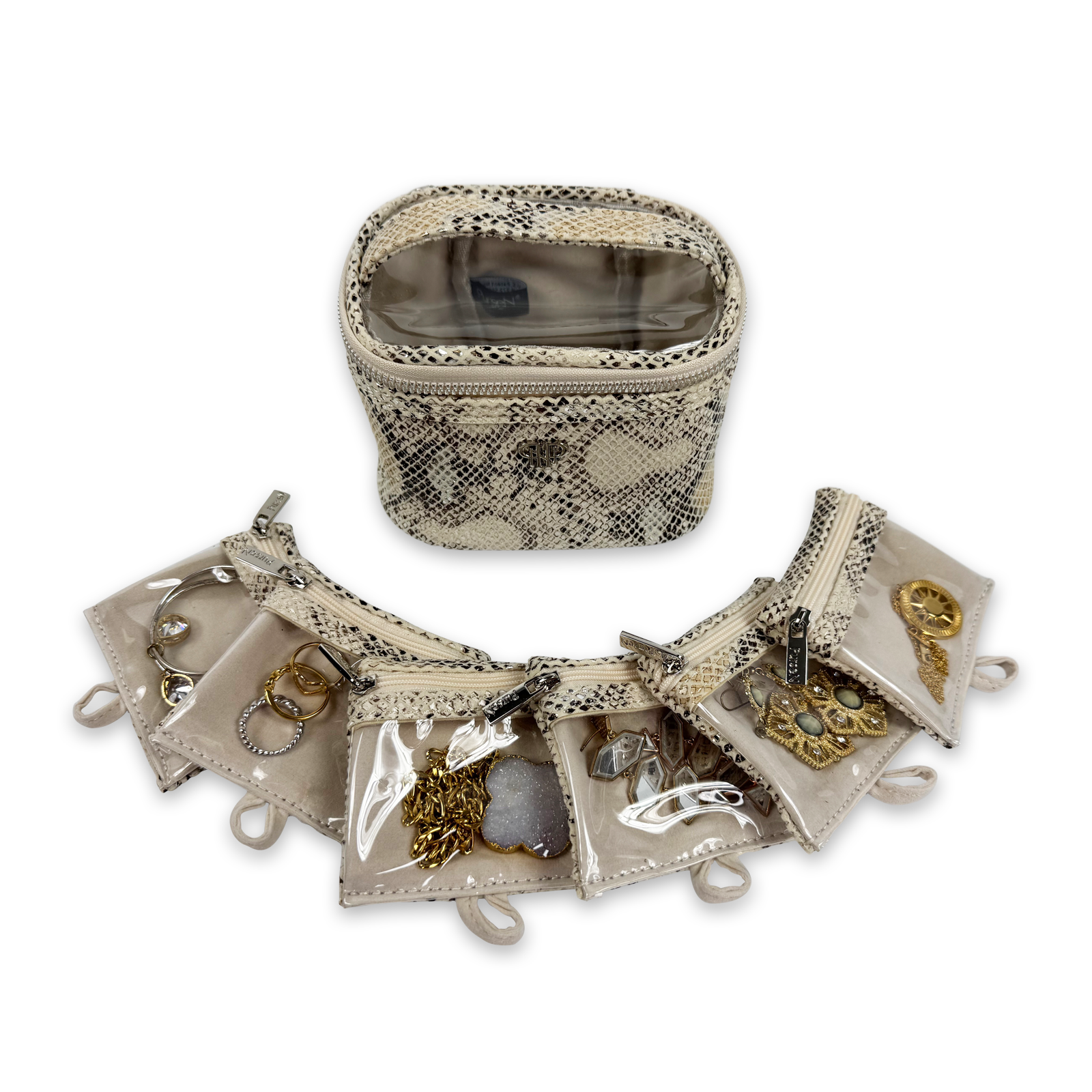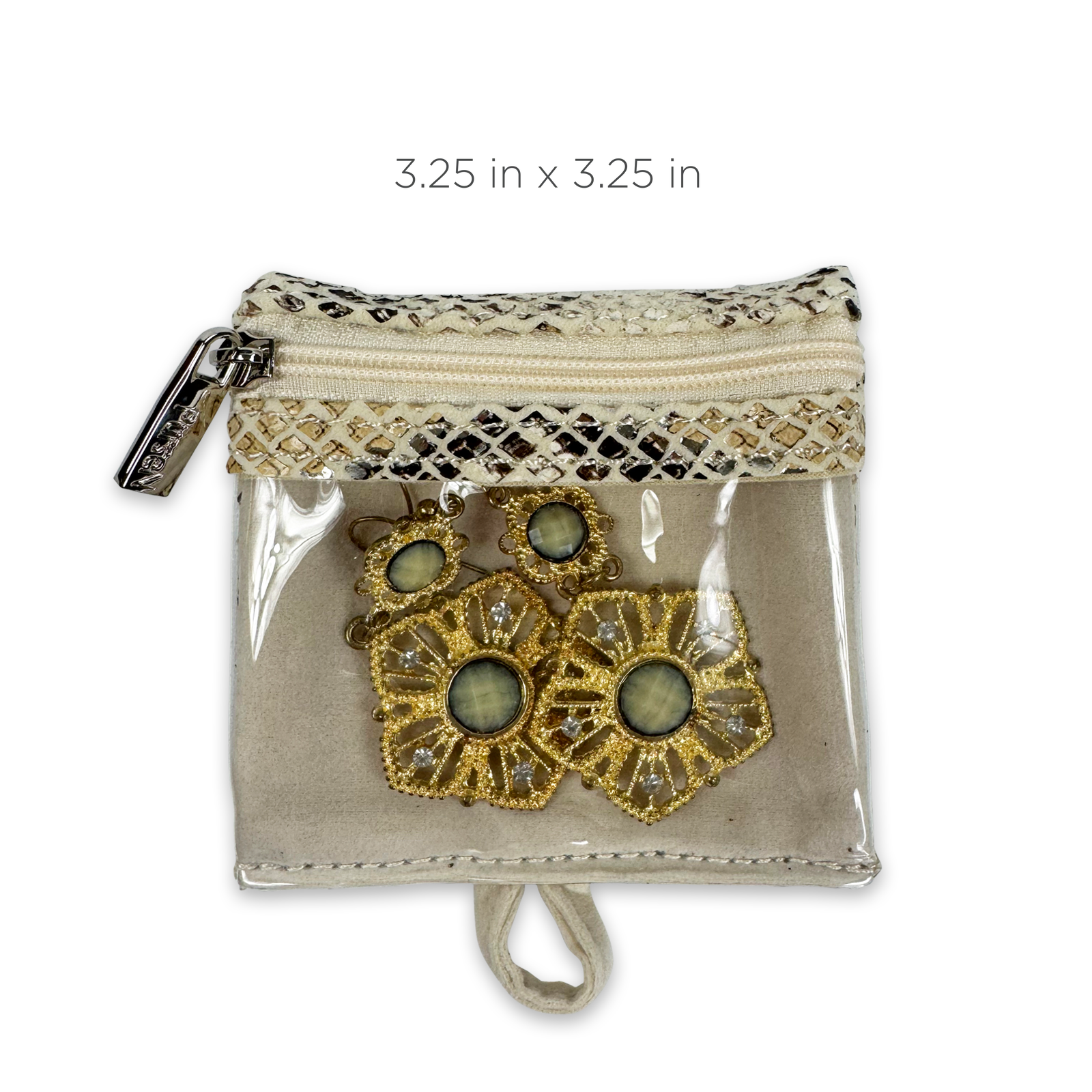 There is nothing more frustrating than misplacing one earring from a set you love. The Safari Sands Getaway Jewelry Case with clear front removable pouches is the solution. Keep your earrings, rings, bracelets and more neatly organized and easy to see. This is the perfect travel case for keeping small to medium jewelry from getting lost or tangled at home or on-the-go.
