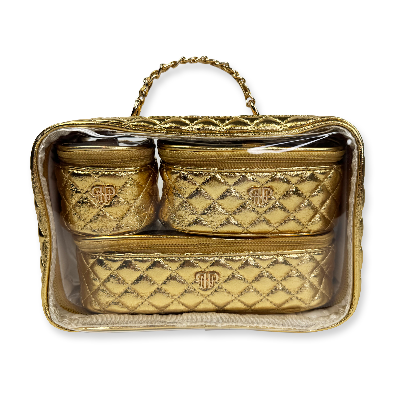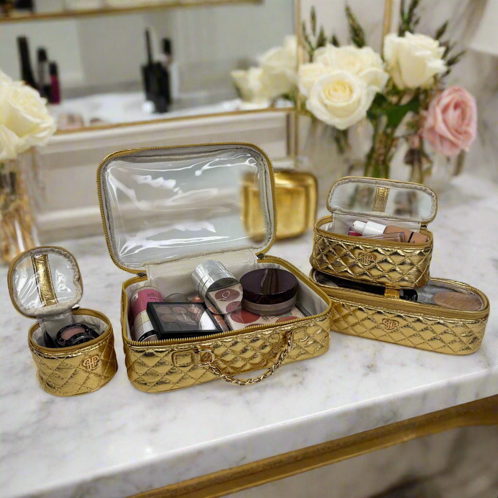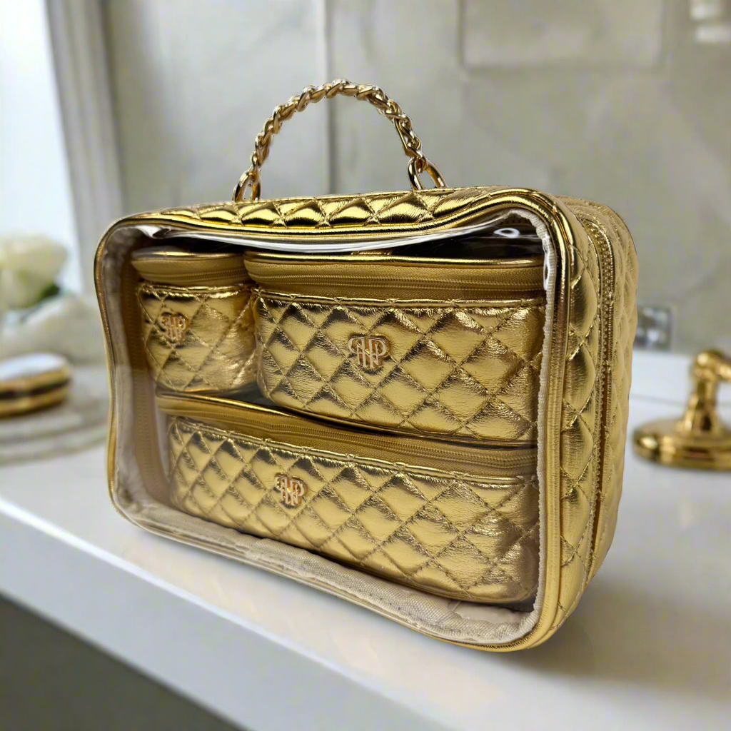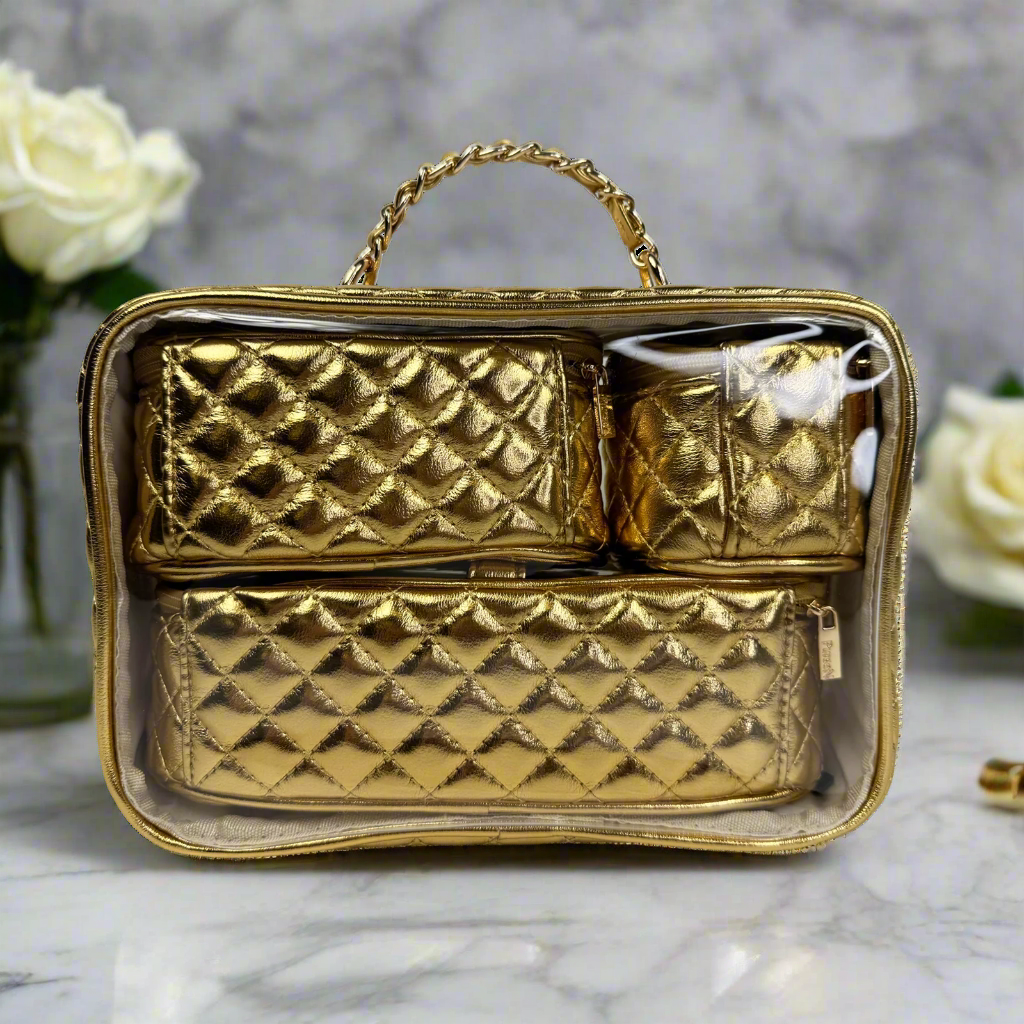 The Trio Jet Setter is your four-in-one answer to beauty on the go - elegant, organized, and effortlessly chic. The quilted metallic 24 Karat takes sophisticated to a whole new level. Inside the clear, structured case with designer inspired chain handle are three removable companion cases (extra small, small, and medium), perfectly sized to keep your makeup, skincare, and everyday essentials in flawless order. Whether you're heading to the office, the gym, or a weekend escape, the Trio Jet Setter keeps everything in place - and your routine looking fabulous every step of the way.