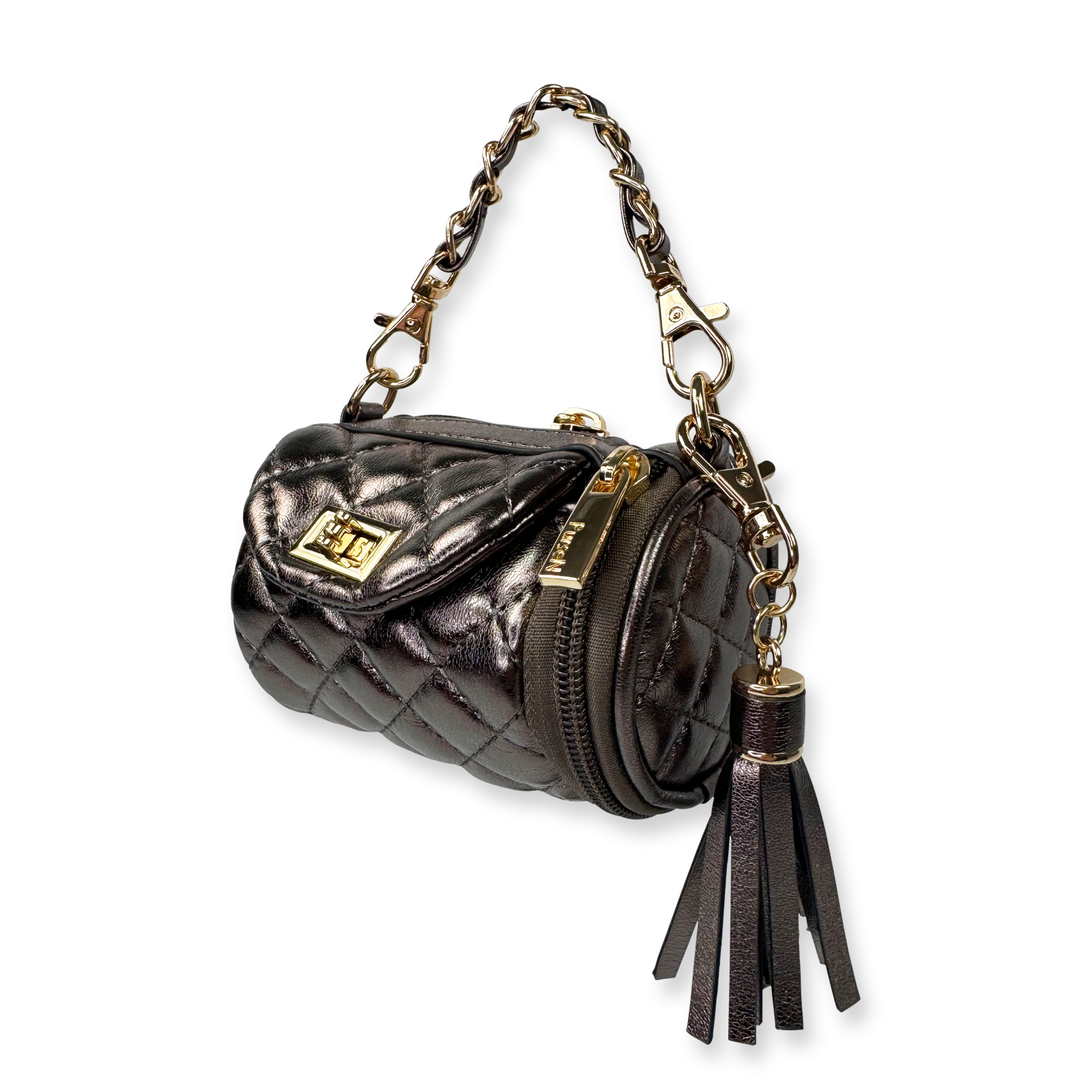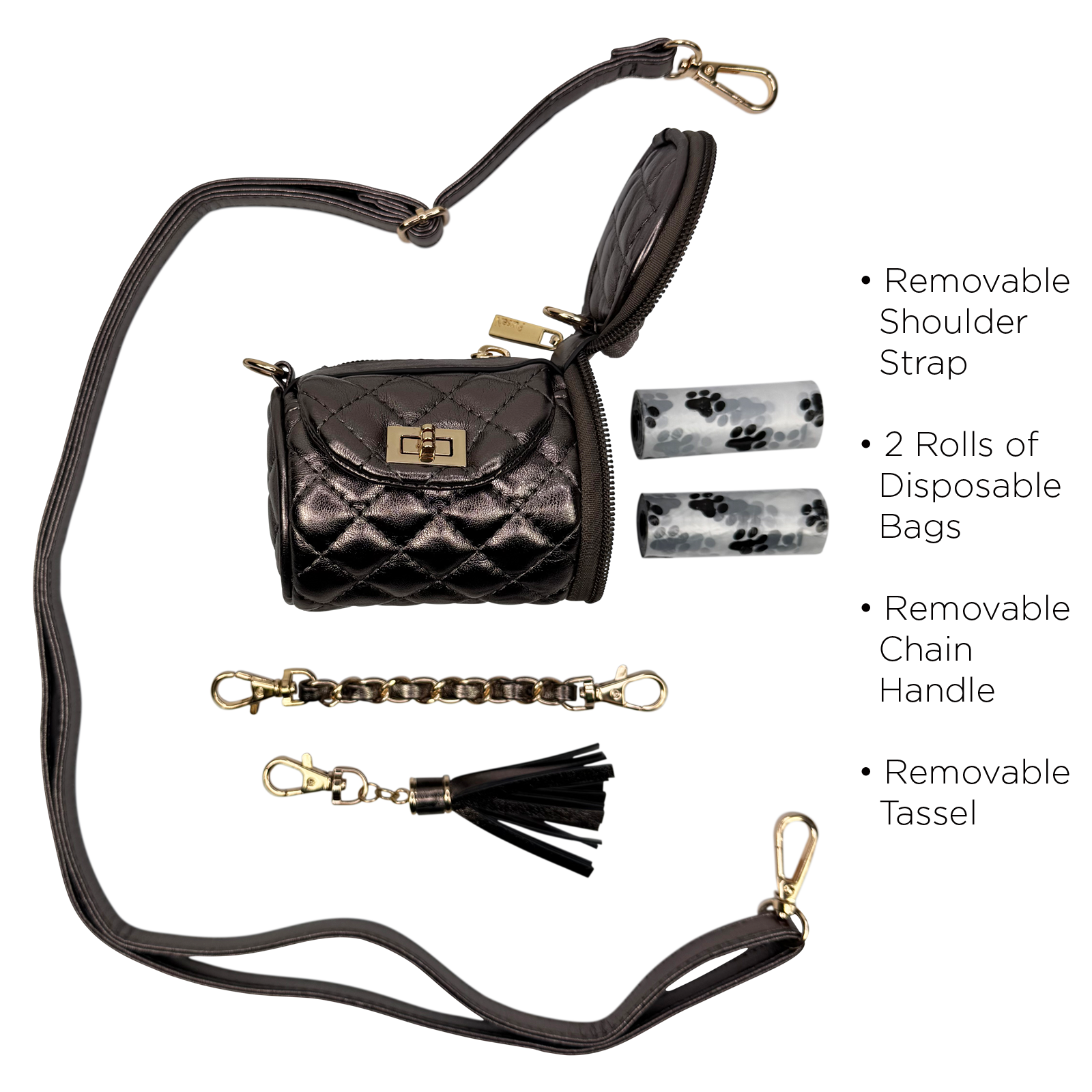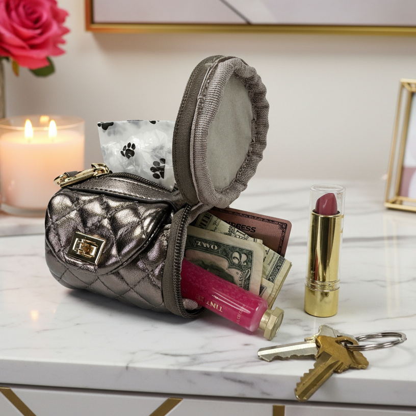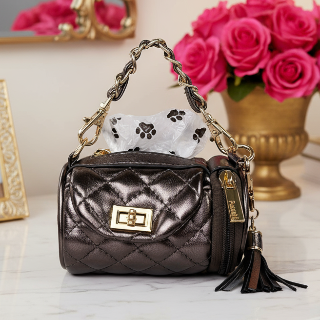 It's time to elevate the dog-walk into a runway moment with the new Poochi Crossbody in gorgeous metallic Bronze. It's a glam little powerhouse that stashes treats, two discreet rolls of 'business' bags, and your own lipstick and keys with red-carpet ease. Clip it to your leash, sling on the crossbody strap, or flaunt the gleaming mini chain as a chic top-handle. However you carry it, the Poochi turns everyday errands into a couture statement - because even a quick spin around the block deserves a touch of diva sophistication.