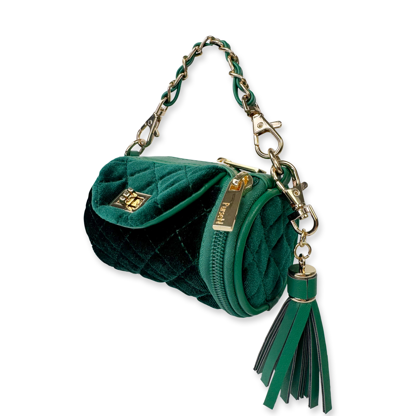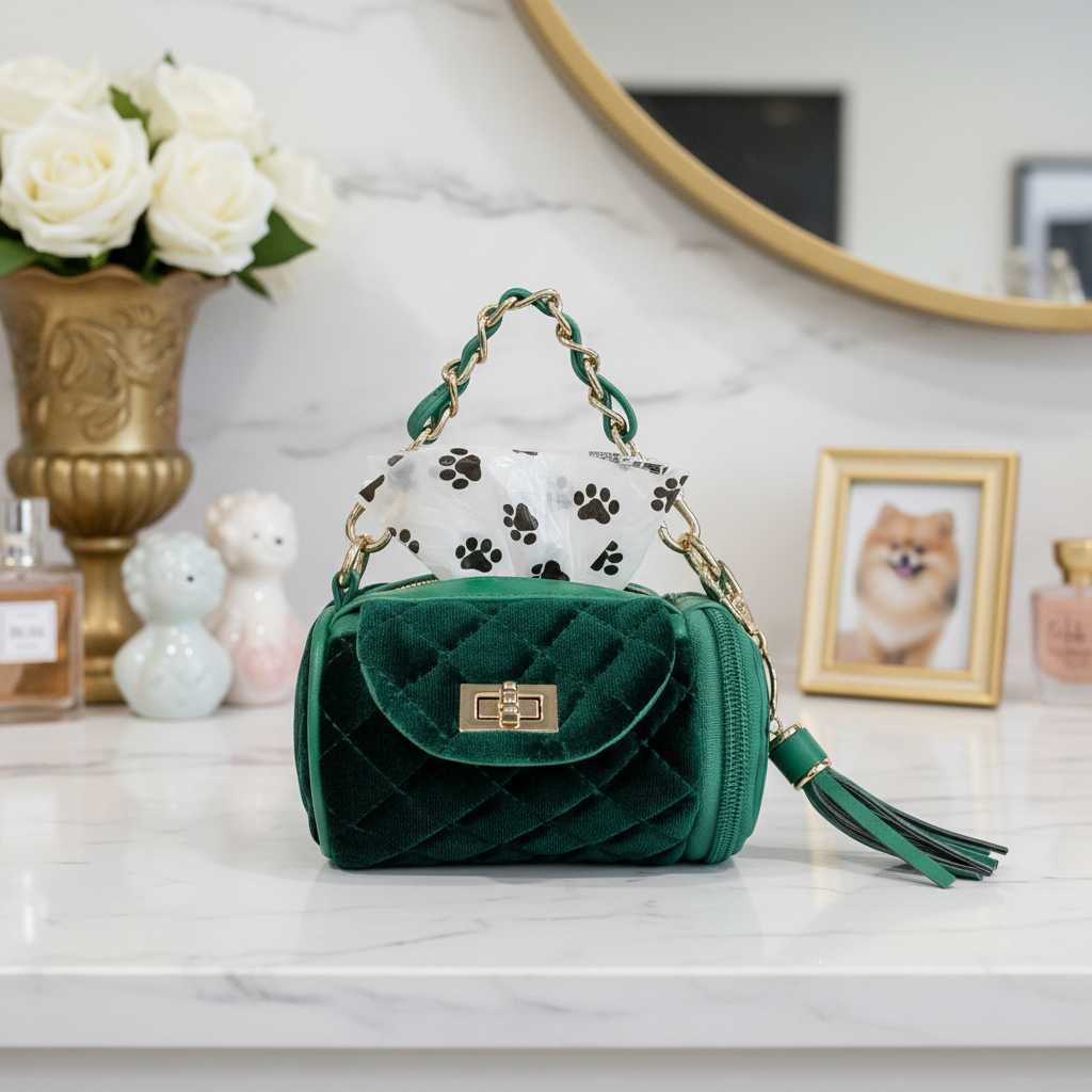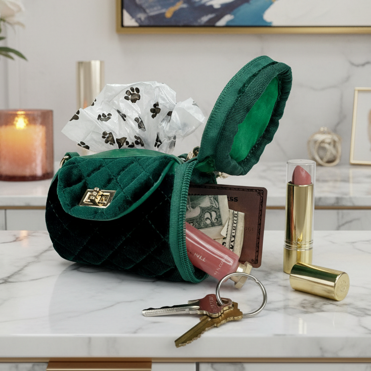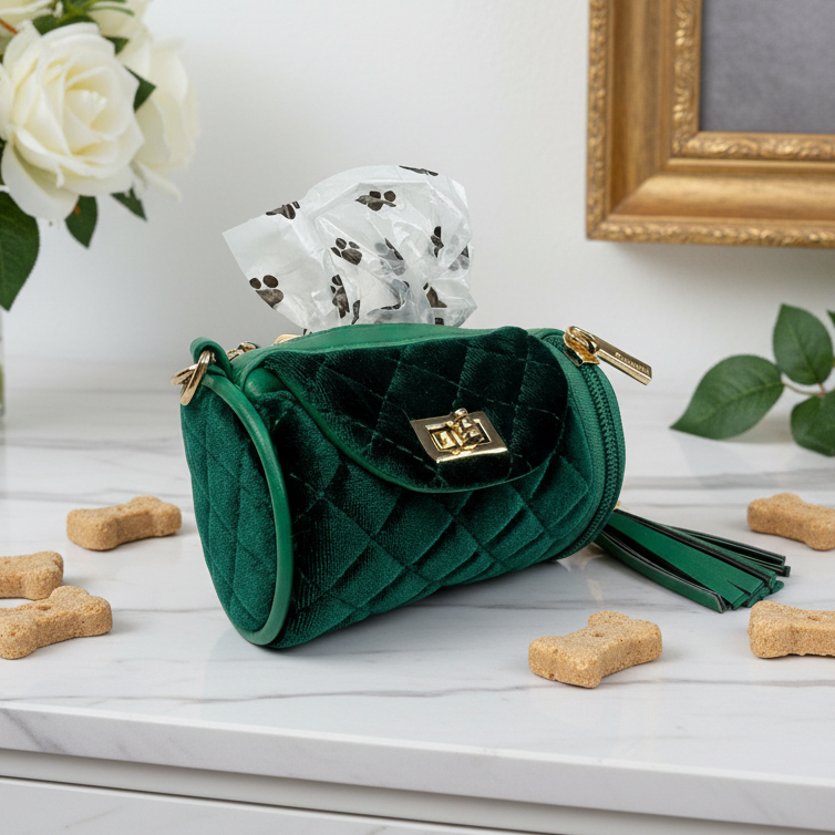 It's time to elevate the dog-walk into a runway moment with the new Poochi Crossbody in luxurious Emerald Velvet. It's a glam little powerhouse that stashes treats, two discreet rolls of 'business' bags, and your own lipstick and keys with red-carpet ease. Clip it to your leash, sling on the crossbody strap, or flaunt the gleaming mini chain as a chic top-handle. However you carry it, the Poochi turns everyday errands into a couture statement - because even a quick spin around the block deserves a touch of diva sophistication.
