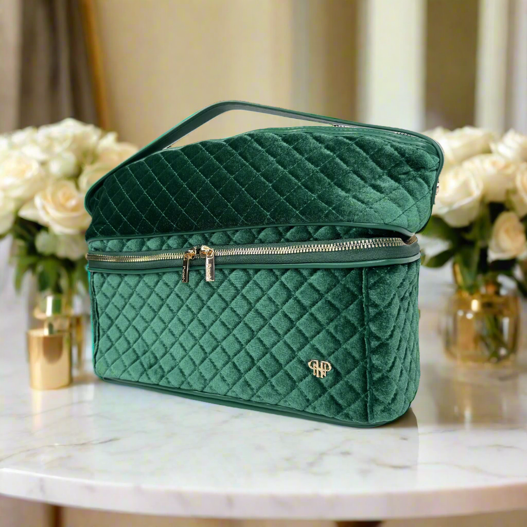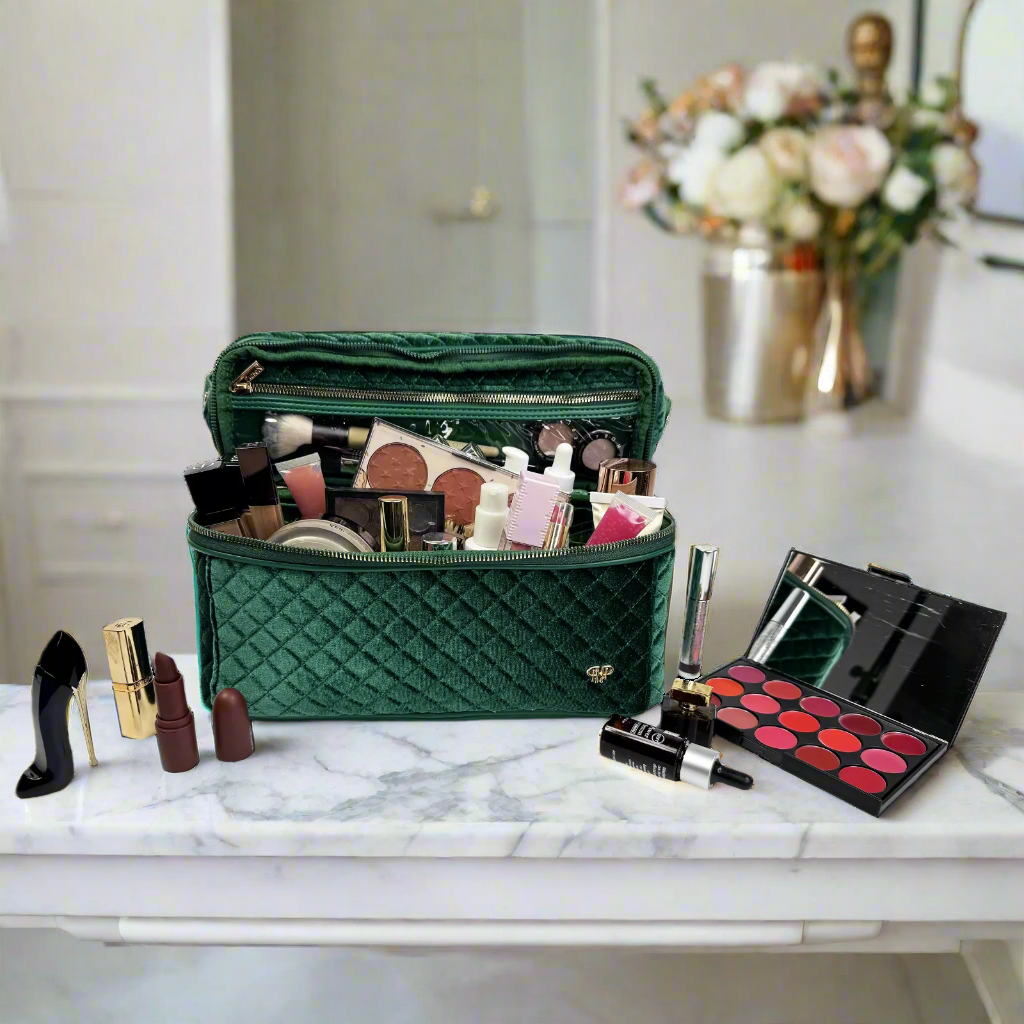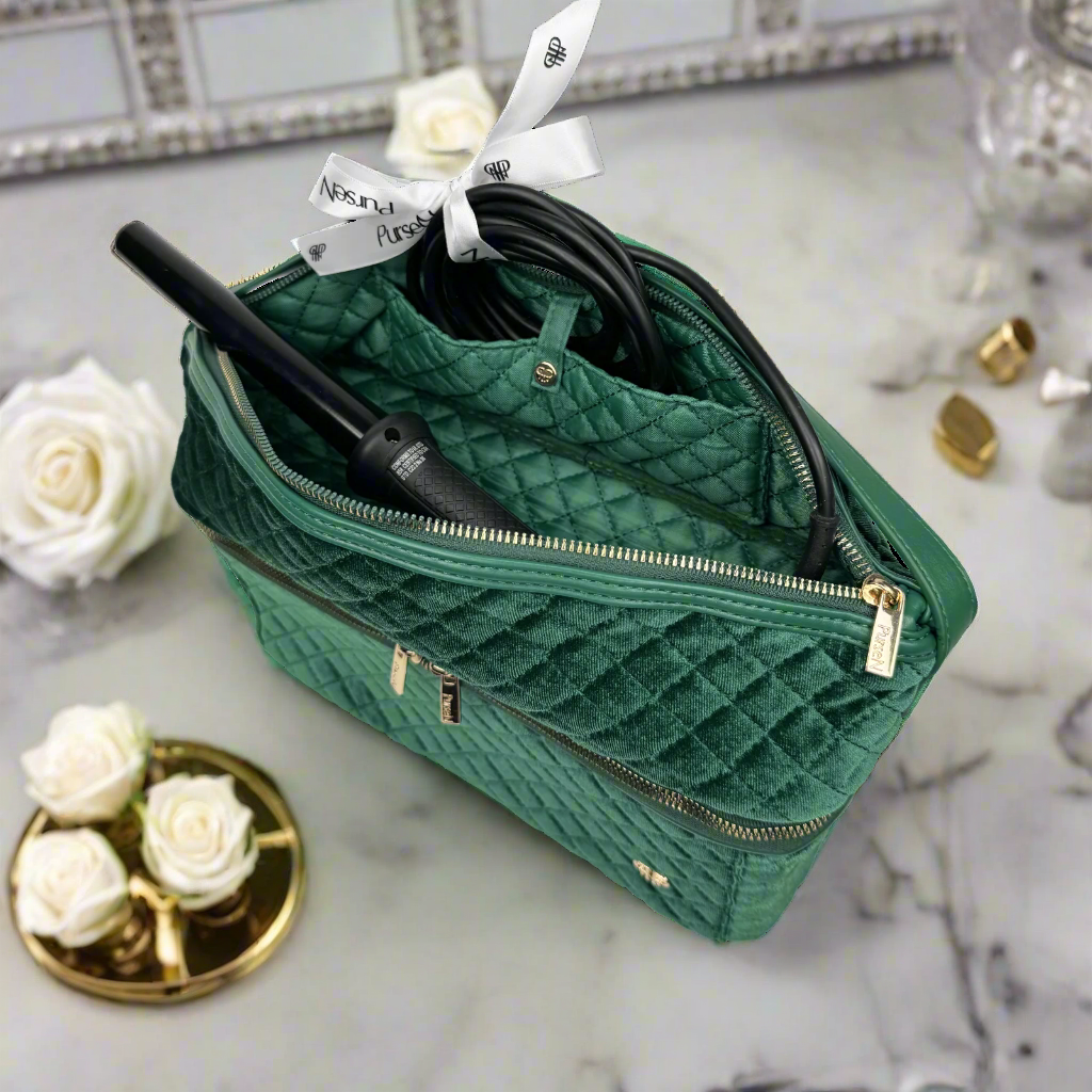 The Emerald Velvet Quilted Stylist Bag is designed for hot styling tools and keeping them separate from your other beauty products. The top compartment features a heat resistant liner so you don’t have to wait to put away your hot tools. The bottom compartment is ideal for larger and heavier items such as bottles, jars, hairbrushes and more. The two combine to make the ultimate toiletry case.