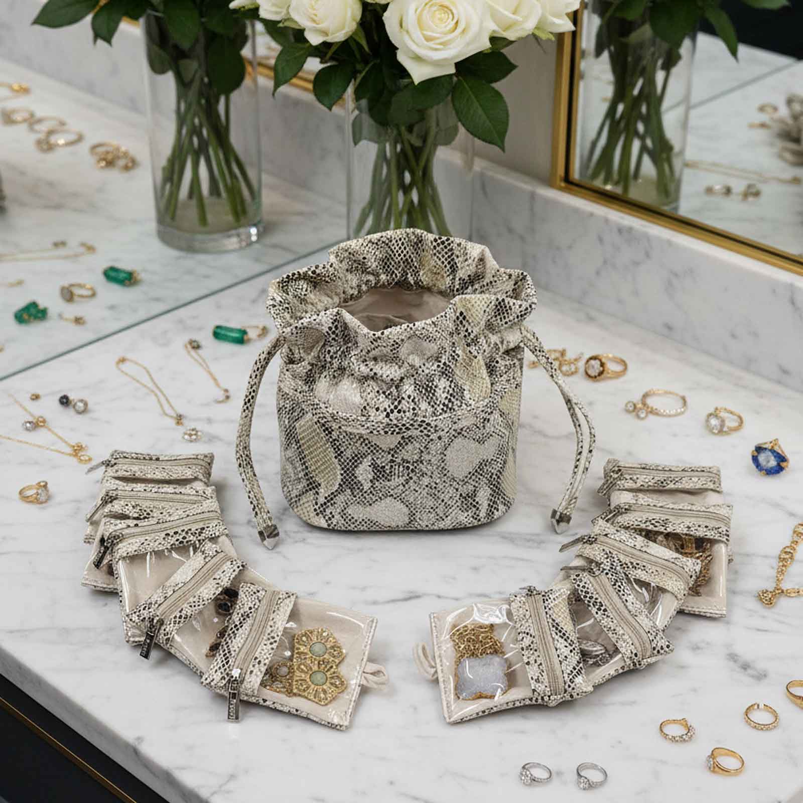 - FOR TRAVEL: Keep jewelry organized and protected with clear window zippered pouches. Easy to find what you are looking for. 10 Total pouches - travel with as many as needed. 2 Additional side snap pockets for bangles, watches, and other larger pieces.