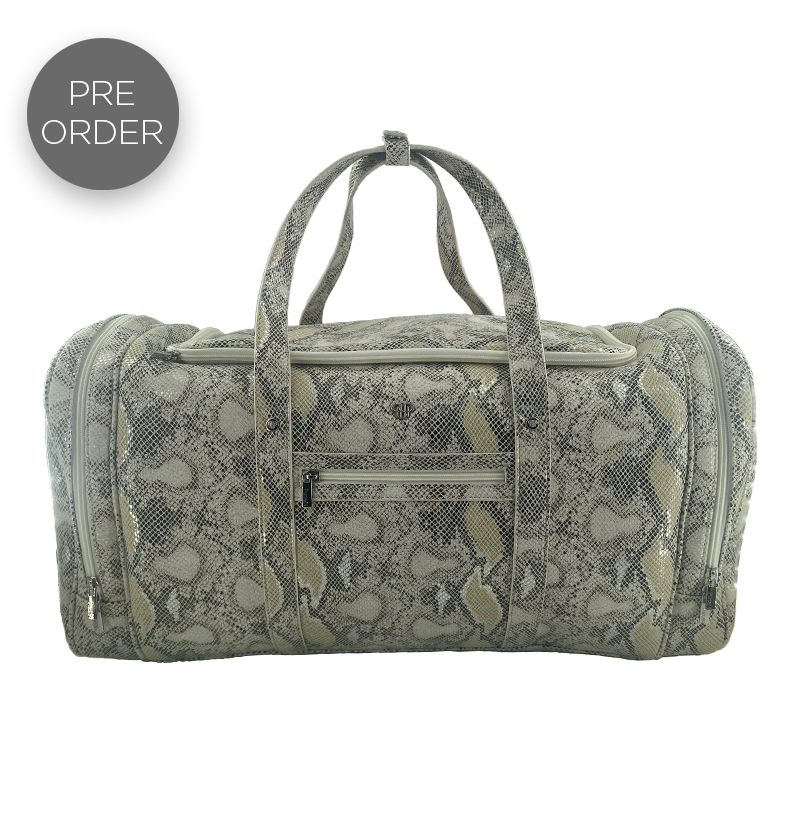 Think SOPHISTICATED! We have taken our VIP Travel Duffel and slimmed it down to make it easy for weekend and overnight trips. Our NEW Safari Sands in a soft classic python pattern with metallic accents is the perfect way to add just the right amount of bling in an understated way and will bring an element of luxury as a travel companion.