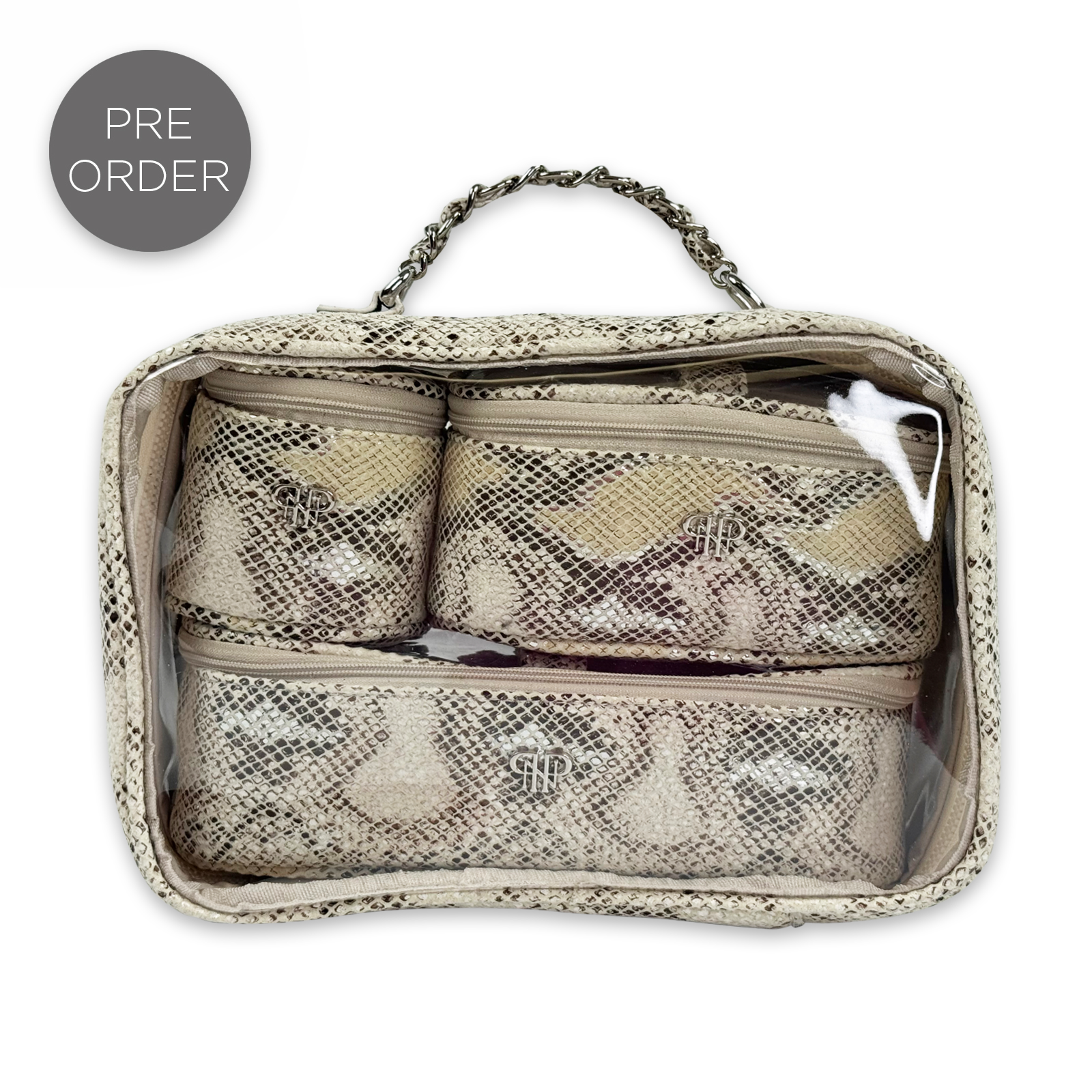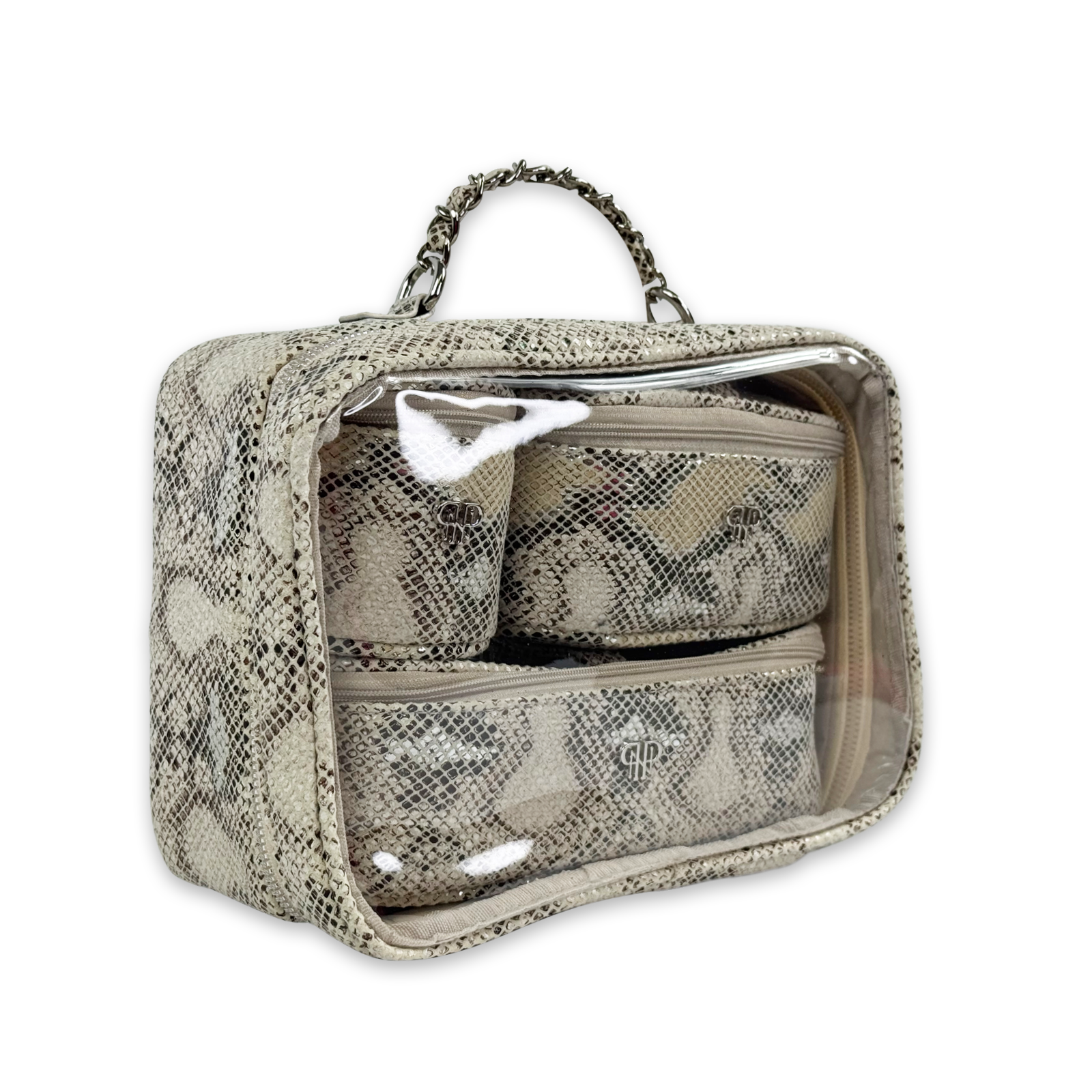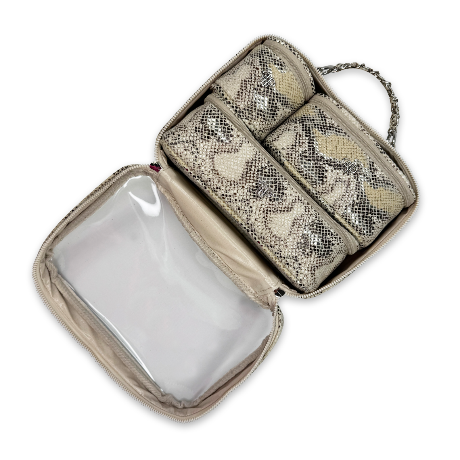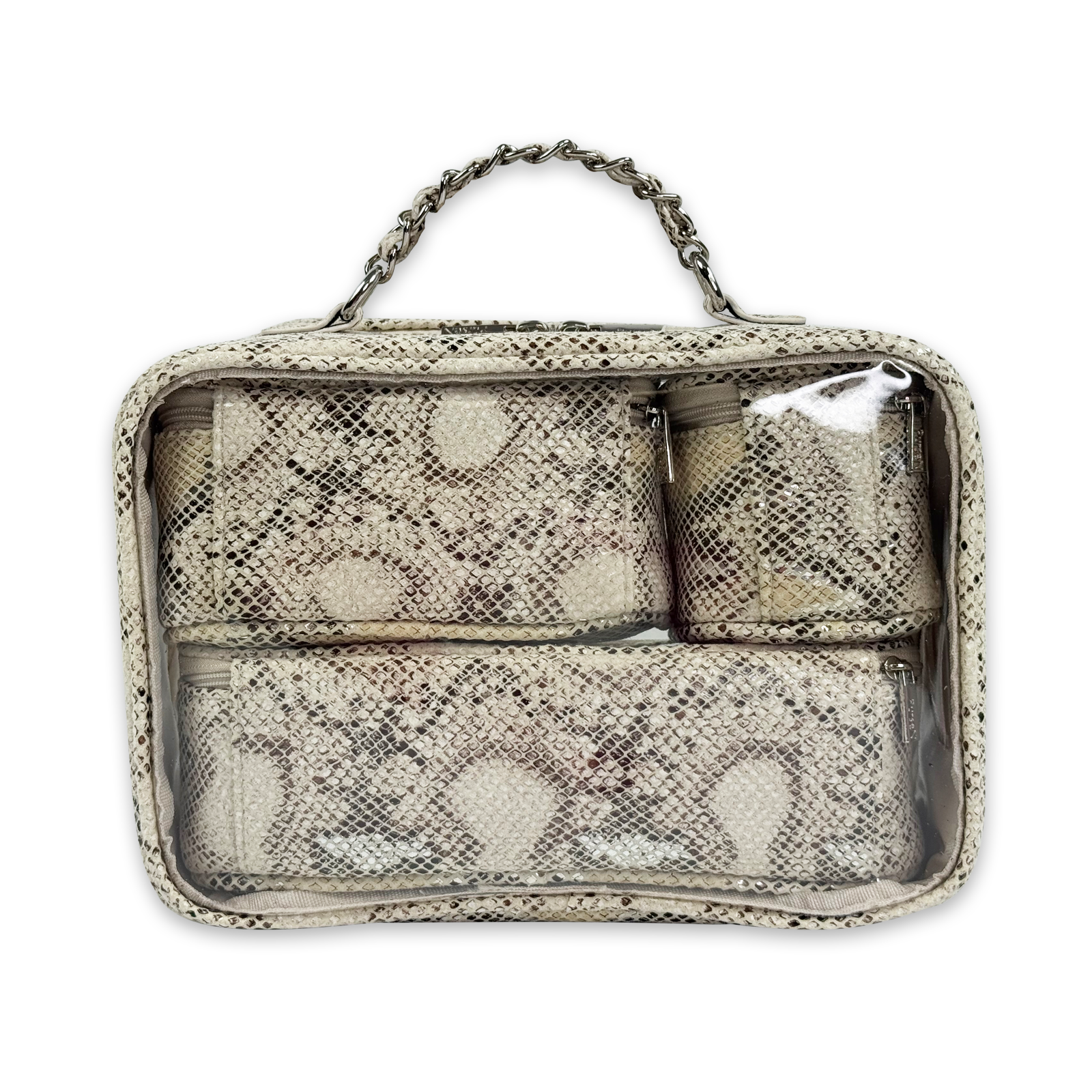 The Trio Jet Setter is your four-in-one answer to beauty on the go - elegant, organized, and effortlessly chic. The ultra sophisticated Safari Sands takes your style to a whole new level. Inside the clear, structured case with designer inspired chain handle are three removable companion cases (extra small, small, and medium), perfectly sized to keep your makeup, skincare, and everyday essentials in flawless order. Whether you're heading to the office, the gym, or a weekend escape, the Trio Jet Setter keeps everything in place - and your routine looking fabulous every step of the way.