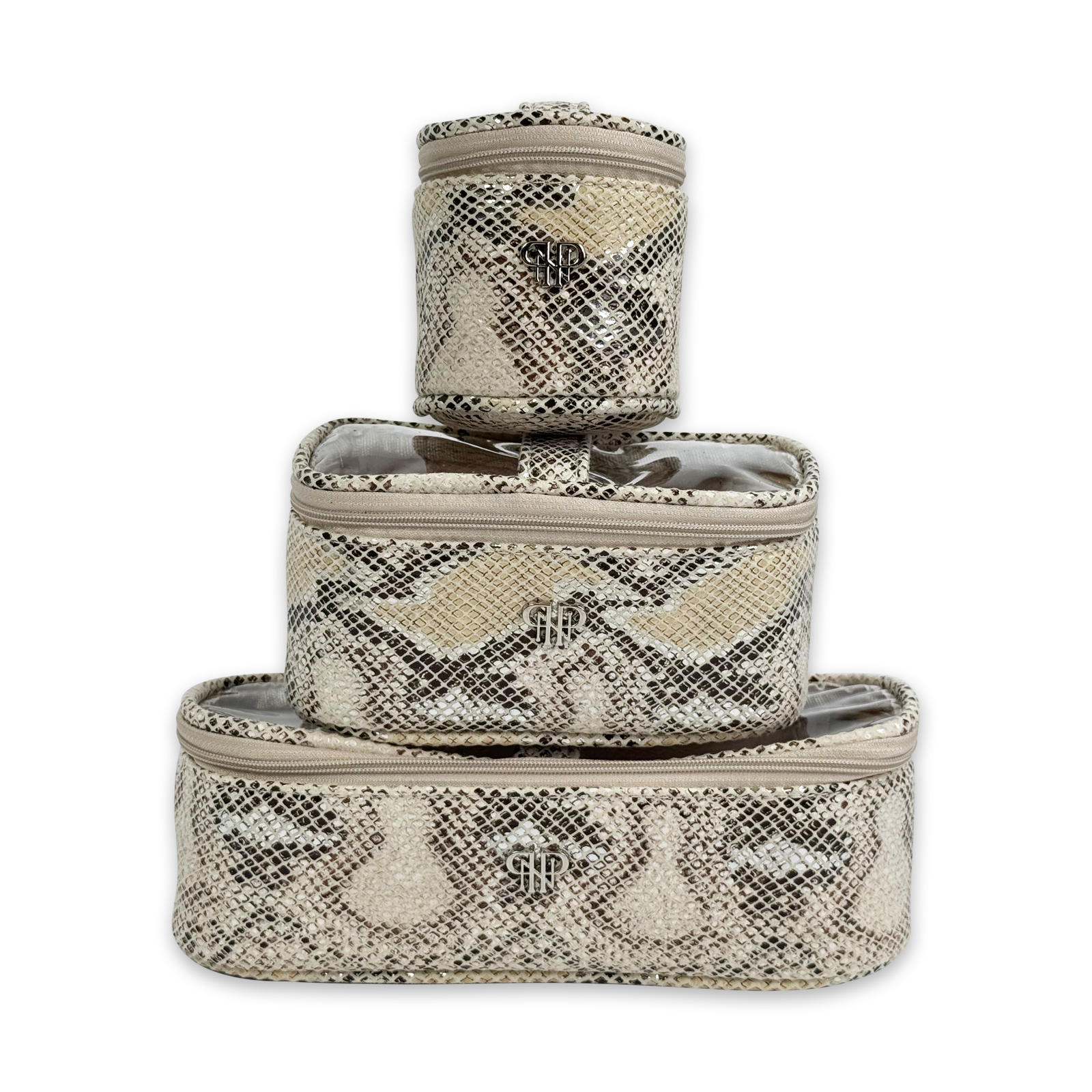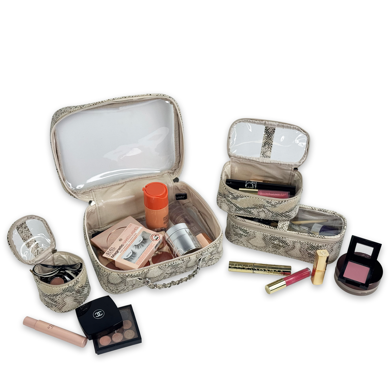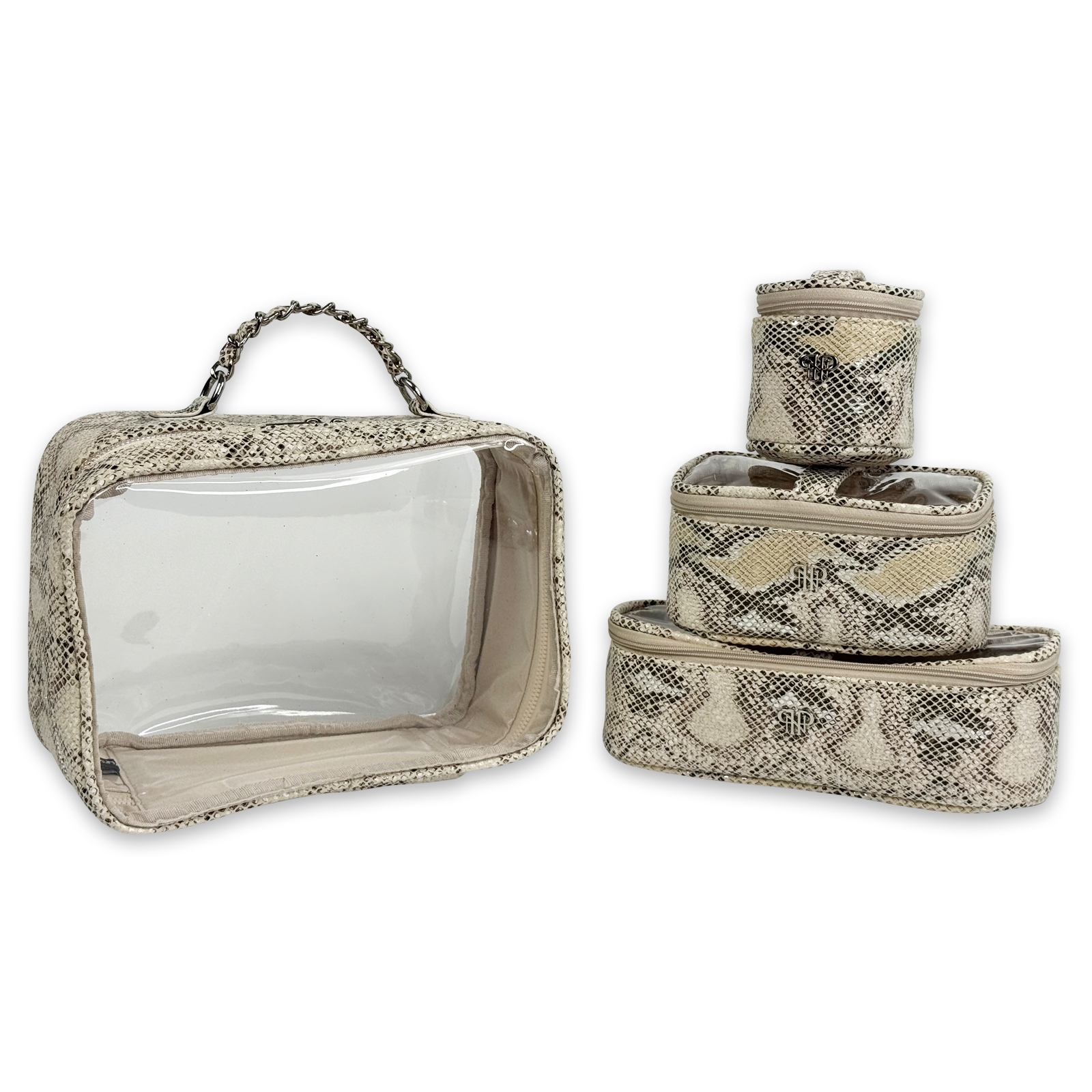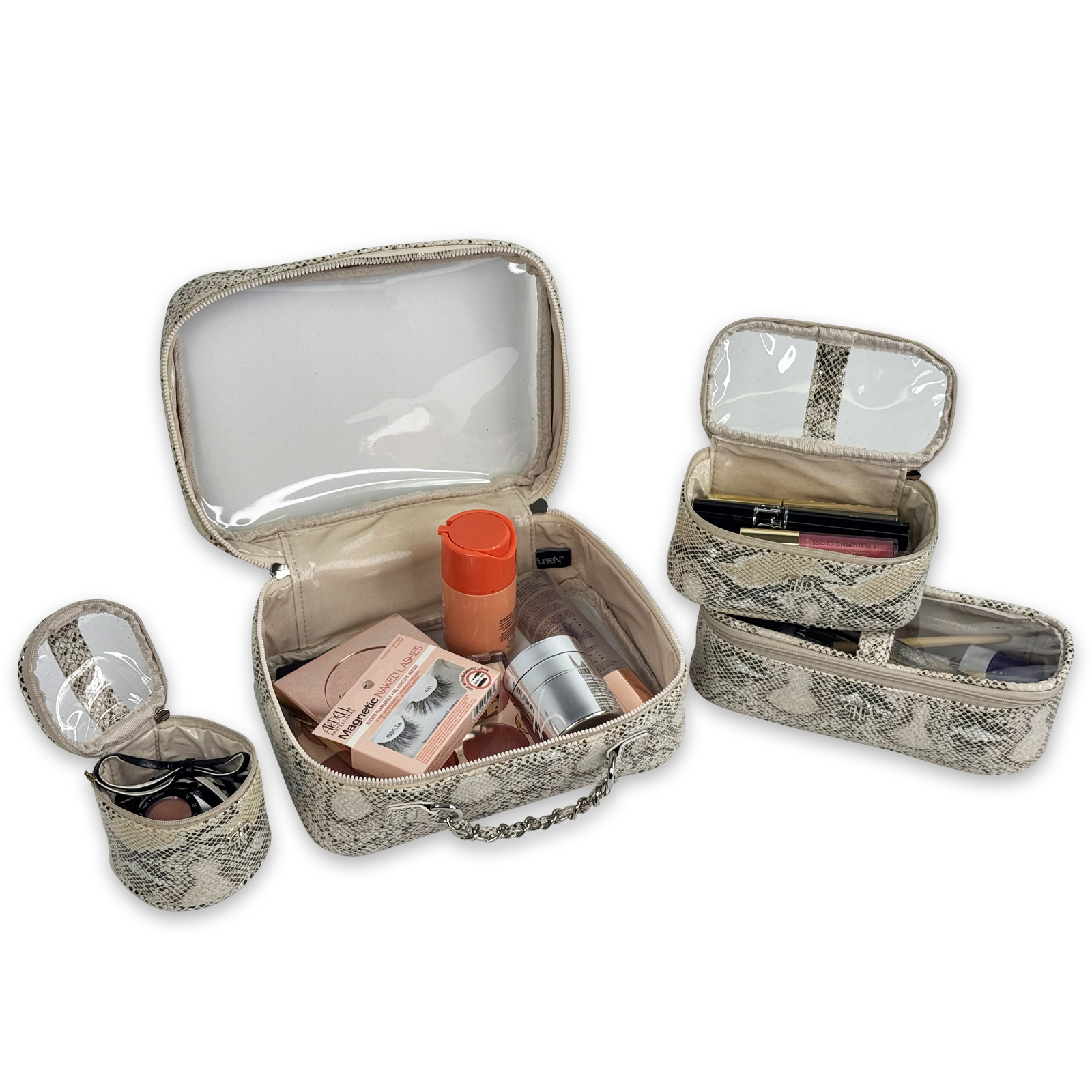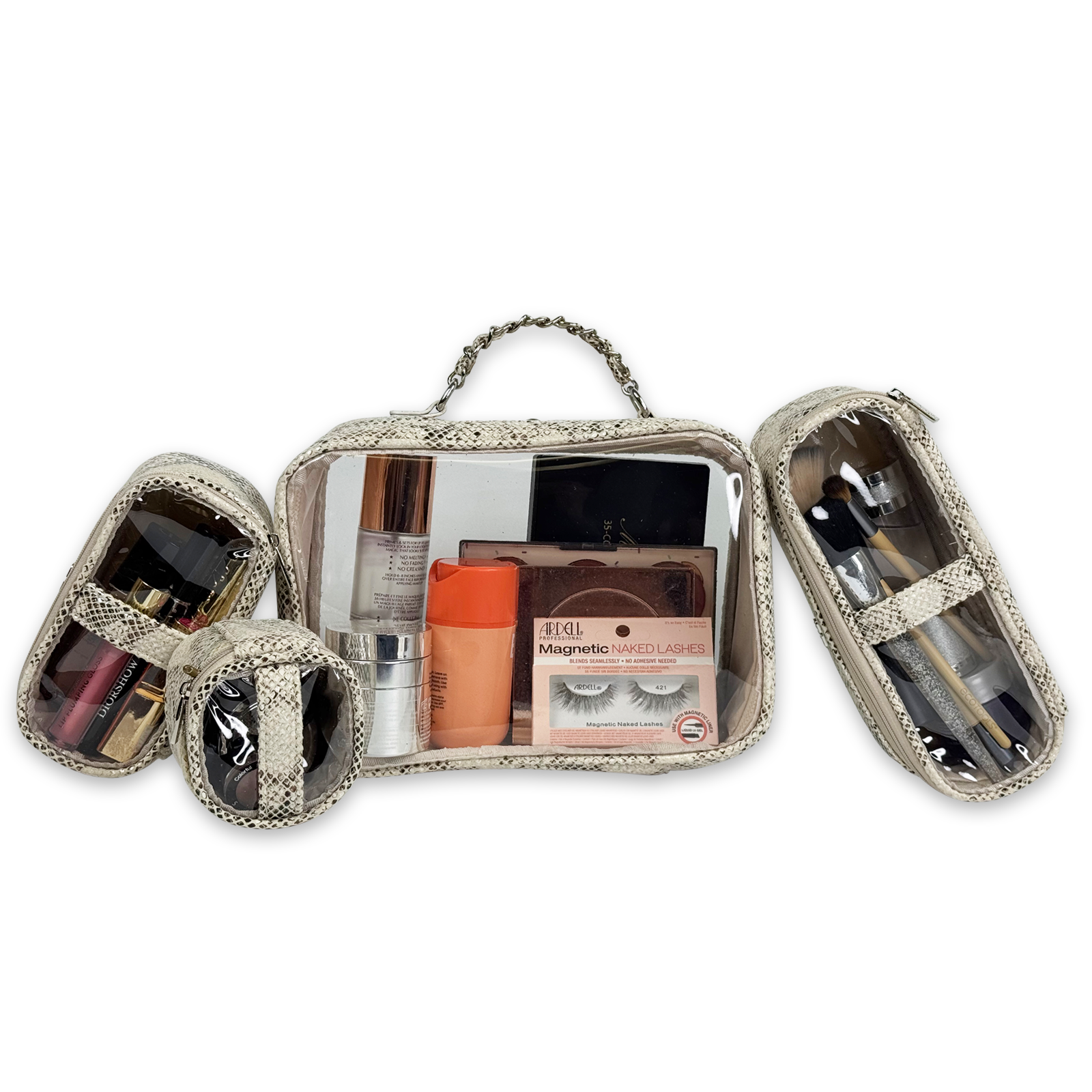 The Trio Jet Setter is your four-in-one answer to beauty on the go - elegant, organized, and effortlessly chic. The ultra sophisticated Safari Sands takes your style to a whole new level. Inside the clear, structured case with designer inspired chain handle are three removable companion cases (extra small, small, and medium), perfectly sized to keep your makeup, skincare, and everyday essentials in flawless order. Whether you're heading to the office, the gym, or a weekend escape, the Trio Jet Setter keeps everything in place - and your routine looking fabulous every step of the way.
