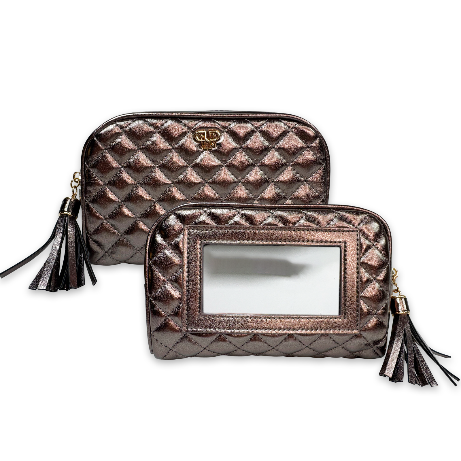 Meet the makeup bag that's as chic as it is practical - with a built-in mirror for effortless touch-ups on the go. The Glam Makeup Case in glamorous Bronze blends everyday function with a polished sophisticated finish. Inside, two slip pockets and a spacious central compartment keep your beauty must haves organized and easy to reach, and the easy to clean wipeable interior is a must! Compact enough to toss in your purse, stylish enough to show off - this is the makeup bag you'll reach for every single day.