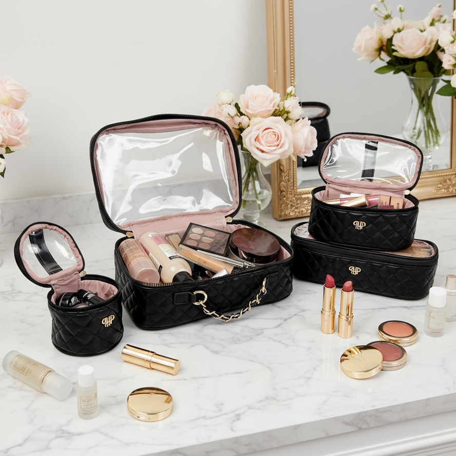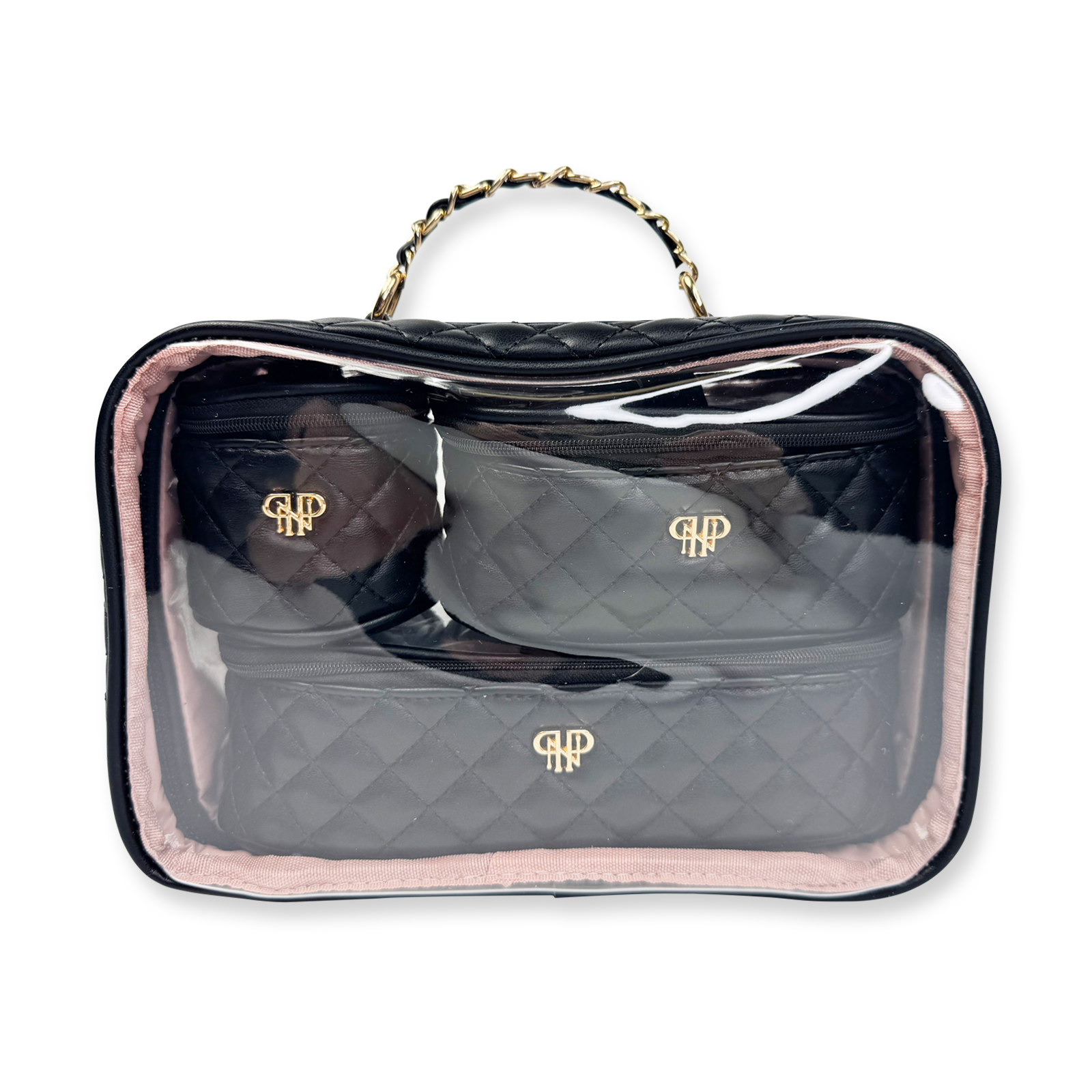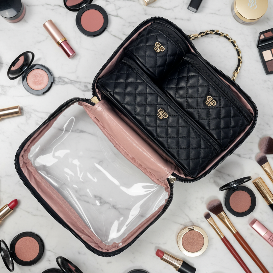 The Trio Jet Setter is your four-in-one answer to beauty on the go - elegant, organized, and effortlessly chic. The quilted classic black Timeless Quilted takes sophisticated to a whole new level. Inside the clear, structured case with designer inspired chain handle are three removable companion cases (extra small, small, and medium), perfectly sized to keep your makeup, skincare, and everyday essentials in flawless order. Whether you're heading to the office, the gym, or a weekend escape, the Trio Jet Setter keeps everything in place - and your routine looking fabulous every step of the way.