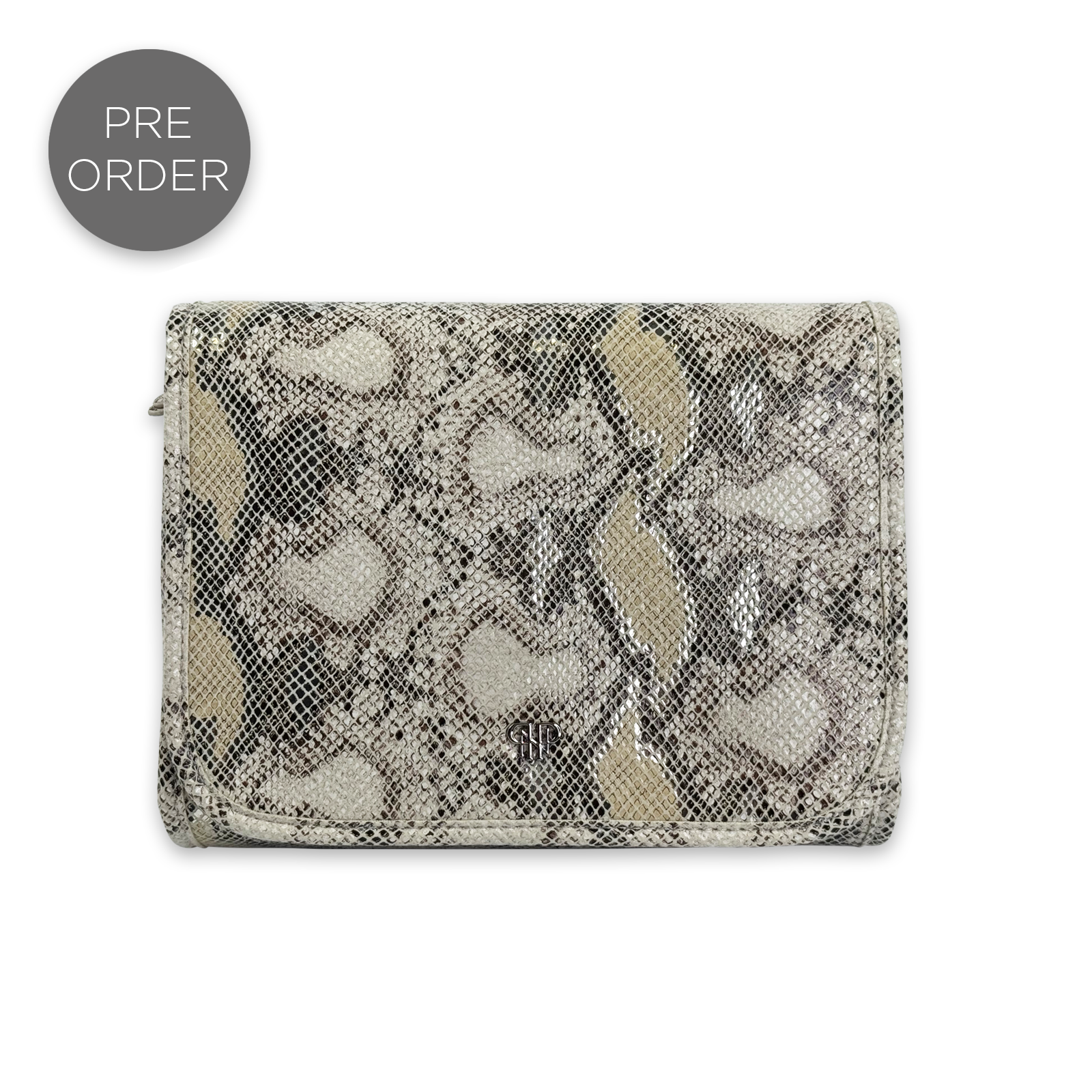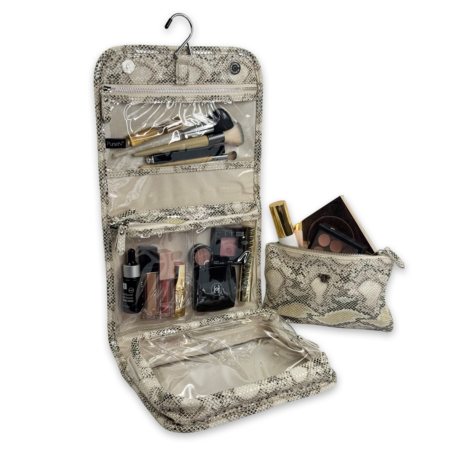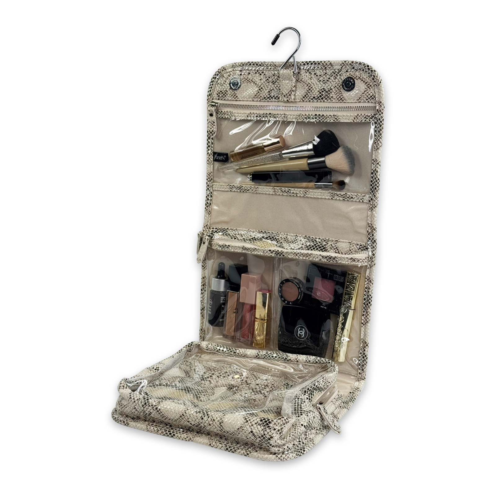 Safari Sands is a beautiful way to add sophistication to your organization. Our classic Hanging Toiletry Case is perfect for travel - keep your toiletries secure and beautifully organized. With the top folding hanger, your items are easily visible and accessible, no matter where your travels take you. All pockets have a clear view design, allowing you to effortlessly admire your essentials without the need to unzip. Additionally, the bottom pocket includes a removable zipper pouch for added storage capacity.